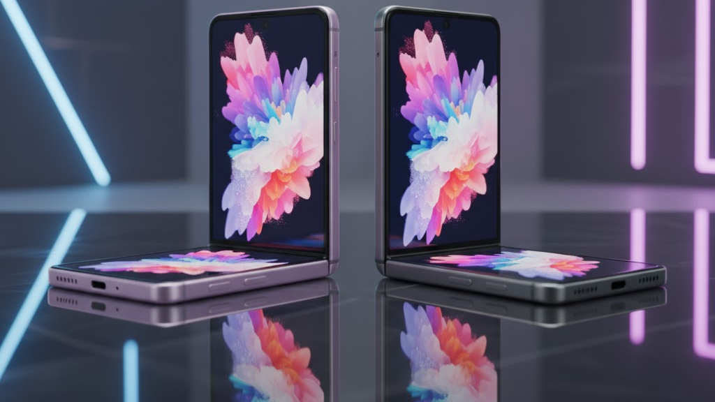 | Featured (Top) | “Samsung Galaxy Z Flip 7 FE unfolded halfway on a reflective table, glowing 6.7-inch AMOLED screen, lavender and graphite colors — ultra-realistic 8K render.” | Samsung Galaxy Z Flip 7 FE in lavender and graphite colors, unfolded halfway on a glossy surface under studio lighting. |